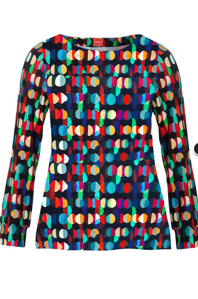 Den flotteste bluse i viscosejersey i det skønneste farverige print på sort baggrund. En helt igennem lækker bluse med rund hals.. Blusen er skåret i en let A-facon. Ærmet har en lille manchet forneden i samme stof som blusen.