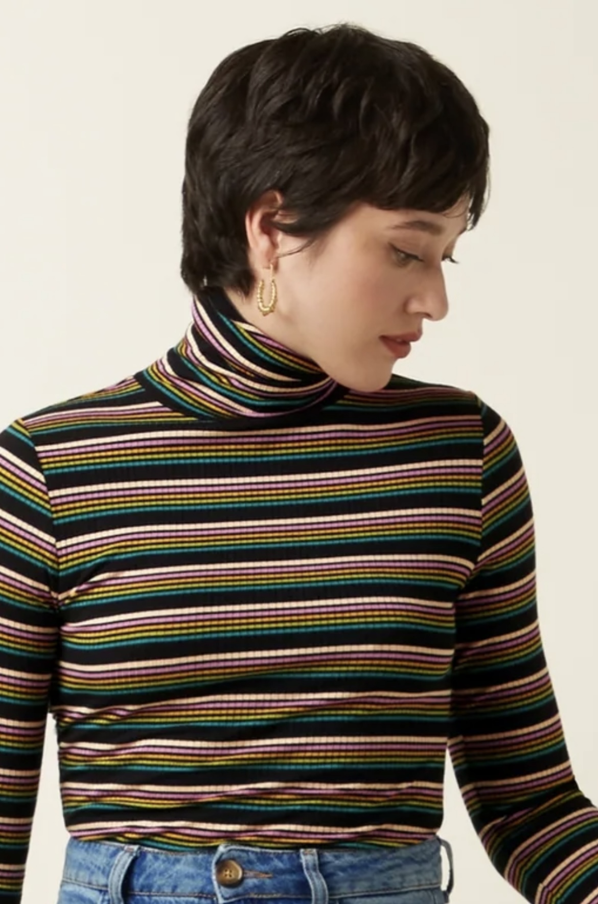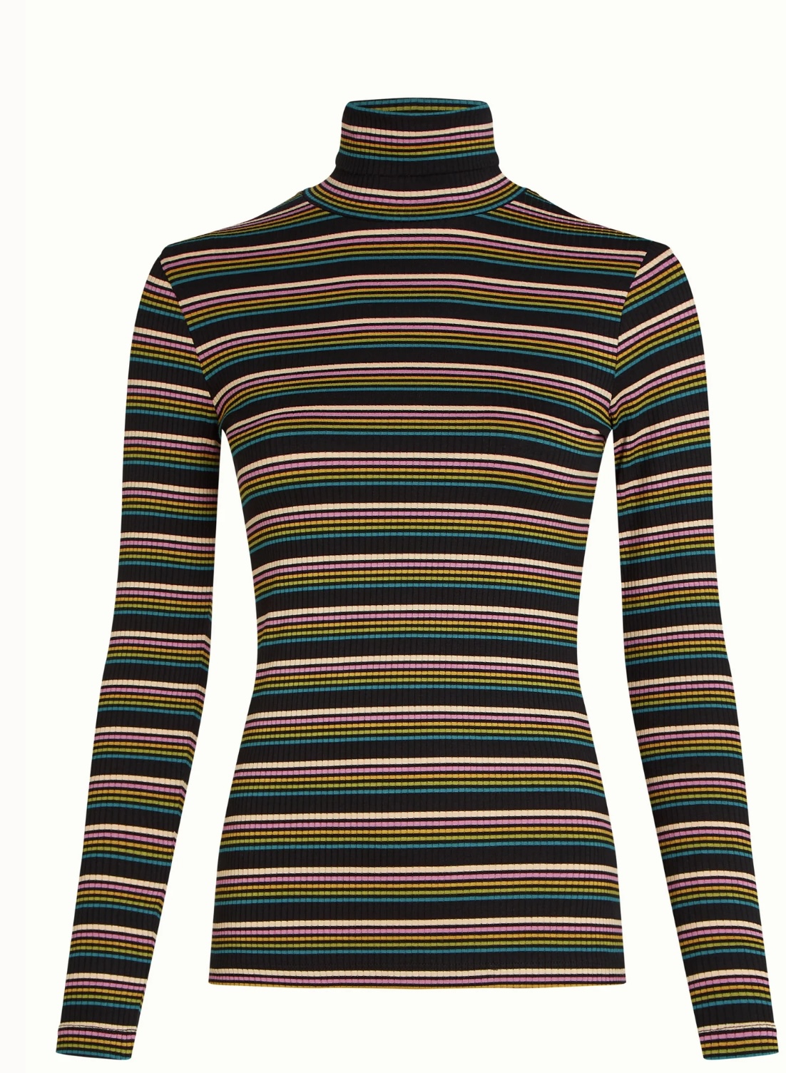 The striped rollneck top features long sleeves and is crafted from stretchy viscose jersey rib fabric, offering both comfort and style.