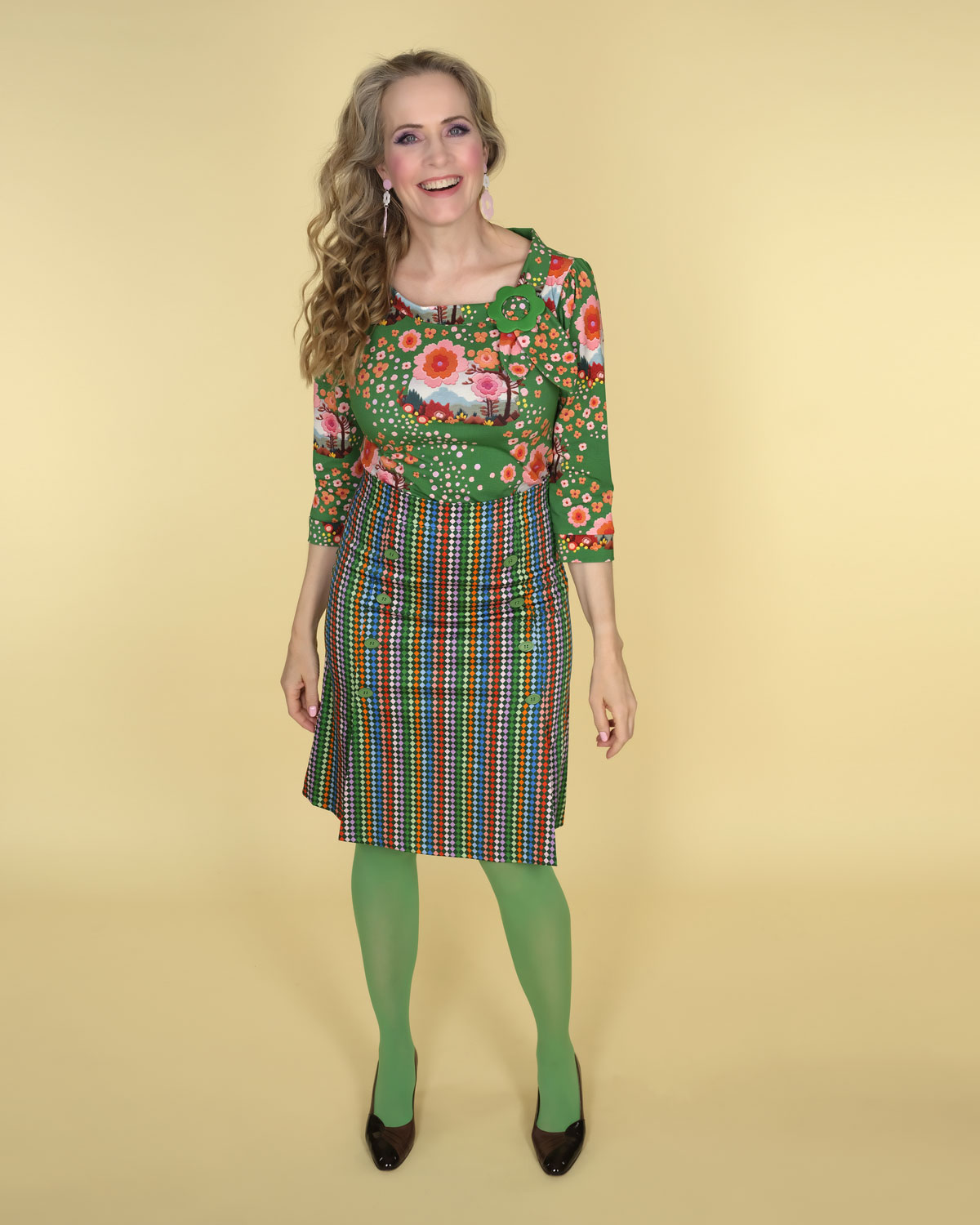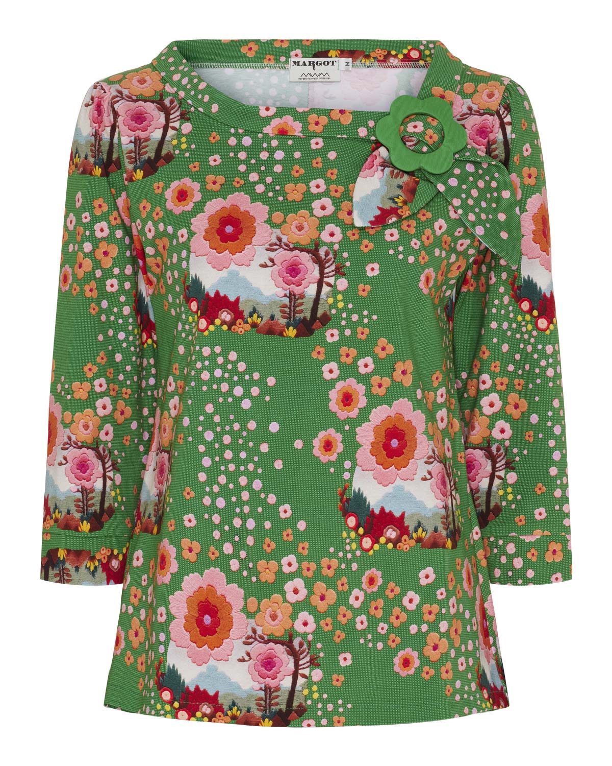 Smuk bluse i grønt tekstil med blomster og landskab. Blusen har semi-lange ærmer med og rund hals med bindebåndsdetalje og grønt spændeDetaljerne