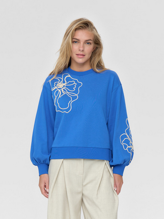 - Sweatshirten har lidt posede ærmer med rynk ved manchetten.
