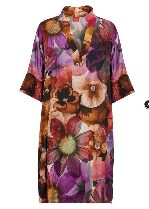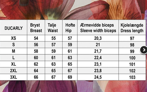 Kjolen har 3/4 lange ærmer med et flot afsluttet åbent ærme og stiklommer i siden. Kjolens hals afsluttes i en smuk krave. Kjolens print er et smukt smukt blomsterprint på dyblilla, røde og brændte efterårsfarver.