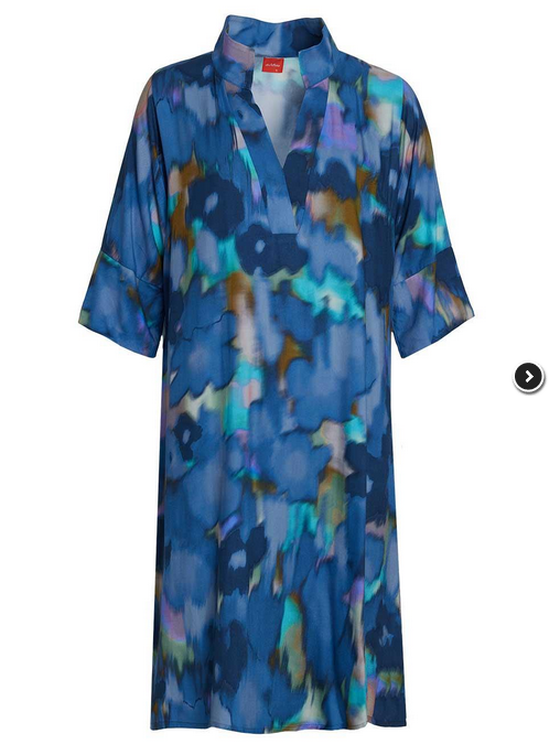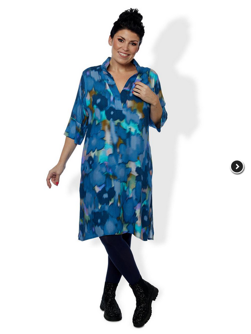 Kjolen har 3/4 lange ærmer med et flot afsluttet åbent ærme og stiklommer i siden. Kjolens hals afsluttes i en smuk krave. Kjolen er i et elegant og flot print, i dusede blå, mørkrød og naturfarver.