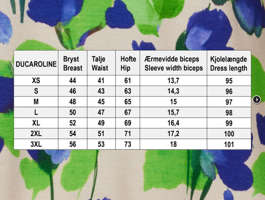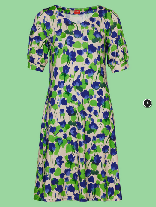 Kjolen har v-hals, og er i et smukt blomster print i kongeblå og limegrønne farver. Den har lommer i sidesømmen. Ærmerne går til albuen og afsluttes med en manchet som giver det en smule "puf".