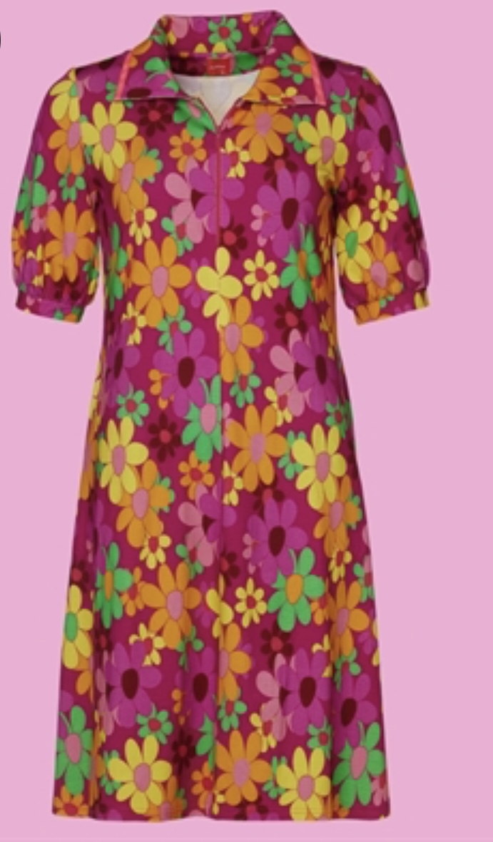 Kjolen har en krave og den har lommer i sidesømmen. Ærmerne er albuelange og afsluttes med en manchet. Printet er blomstret i mange forskellige klare farver.