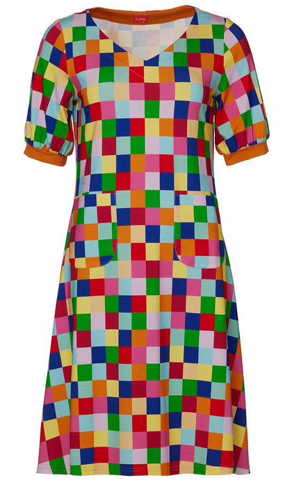 Kjolen har en blød v-hals og den har lommer i sidesømmen. Ærmerne er albuelange og afsluttes med en manchet. Printet er firkanter i mange forskellige klare farver.