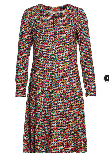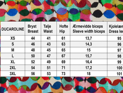Kjolen har rund hals der afsluttes i en kort lynlås som giver dig mulighed for at åbne mere op og skabe en v-hals i den dybde du selv ønsker. "Circles in Colours duCaroline" kjolen er i et grafisk print af cirkler og bobler i blå, pink,røde, grønne, turkise og orange toner. Kjolen har lommer i sidesømmen. Ærmerne er lange og går til håndleddet.