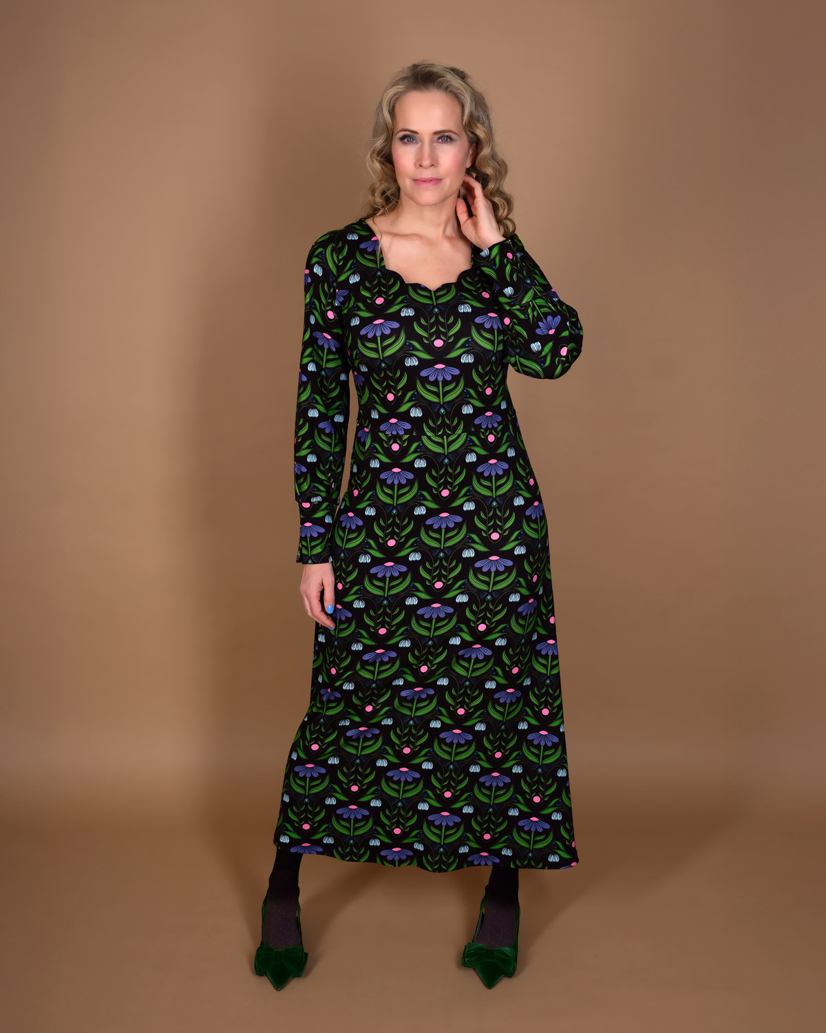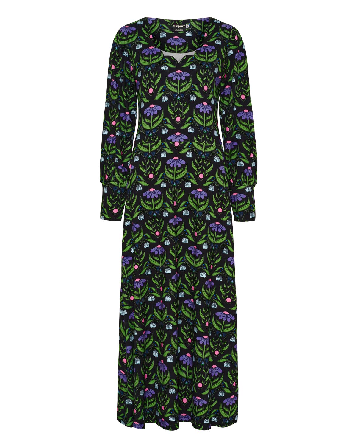 Sort maxi kjole med en klassisk aura, retrovibed wallpaper blomster mønster. Kjolen har en smuk detaljeret hals udskæring, lange ærmer med høj manchet. Kjolen skæres i taljen og har lommer.