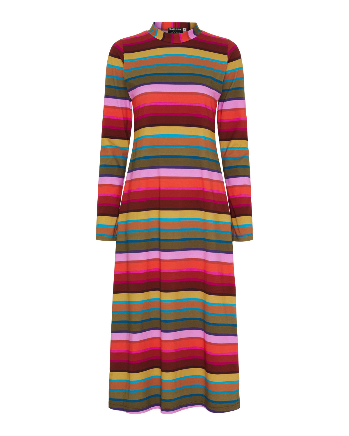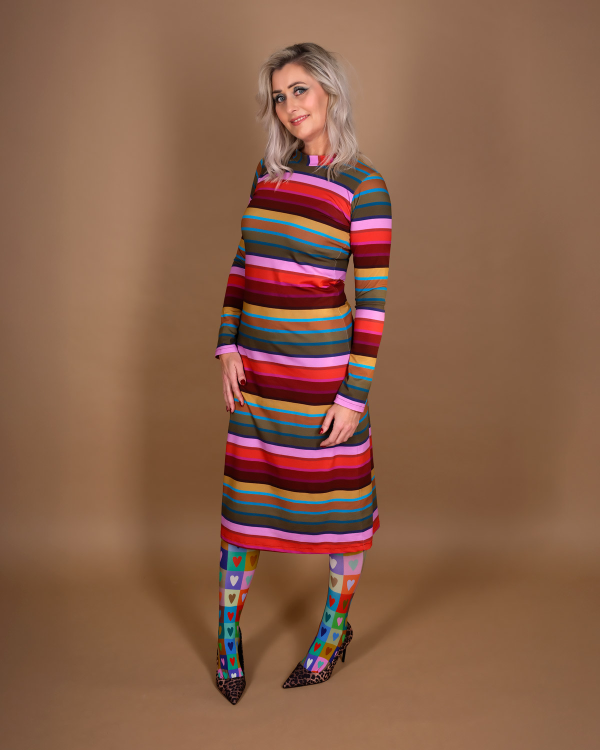 Super smuk semi-lang rullekrave kjole i et multi farvet stribet mønster, farvenuancer fra vinrød/rød/lyserød hen over blå toner til flere variationer af army og karry . Ærmerne lange og smalle.Detaljerne- Semi-lang turtleneck kjole i flot stribet mønster, lange ærmer