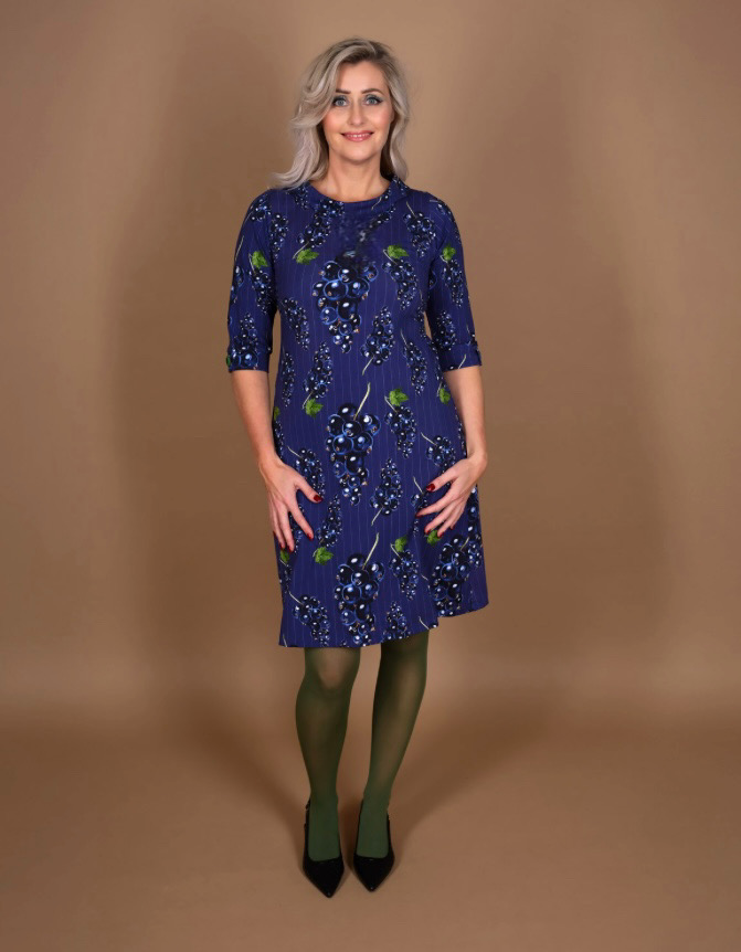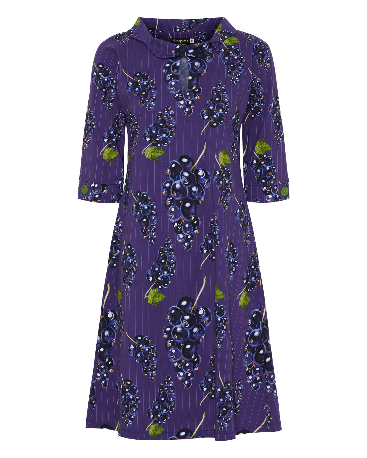 - Kjole i strækstof, dyb lilla med pinstripes og vindruer