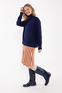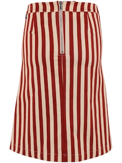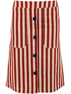 Nederdelen har et smukt snit, store lommer og knapper foran. Nederdelen lukkes med en lynlås bagtil. Canvasnederdelen har fine striber i brændt rød og varm sandfarve.