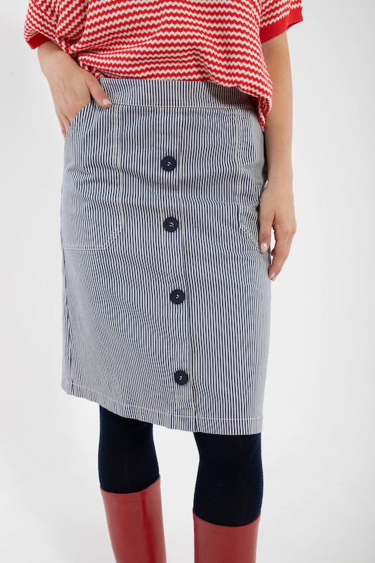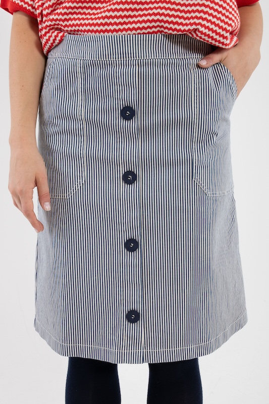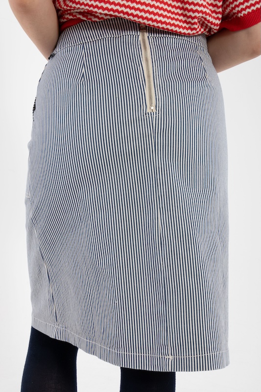 Nederdelen har et smukt snit, store lommer og knapper ned foran. Nederdelen lukkes med en lynlås bagtil.