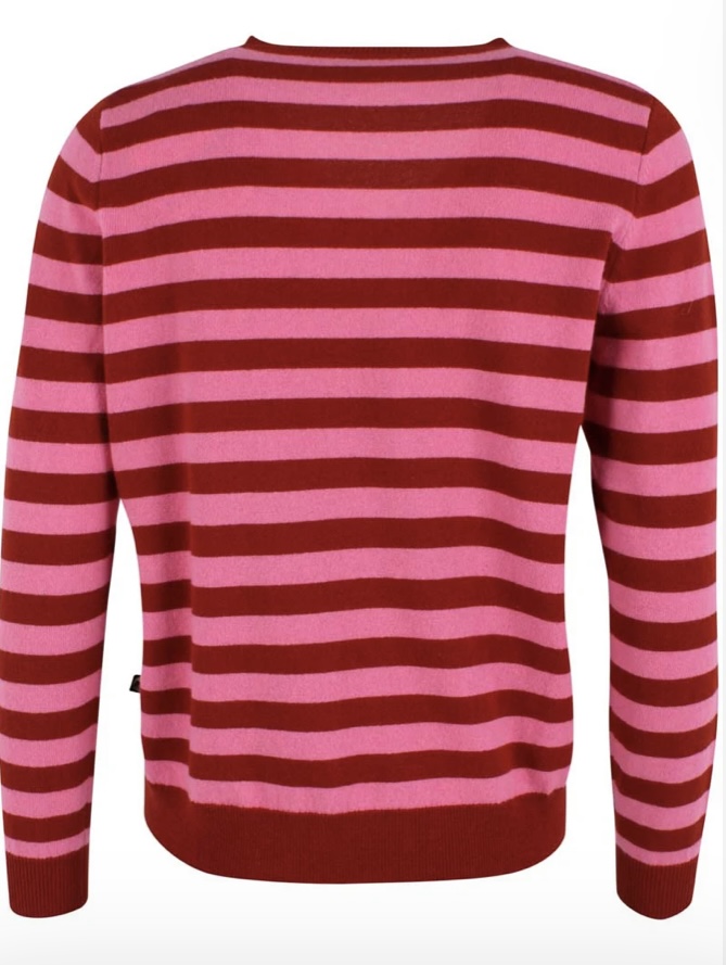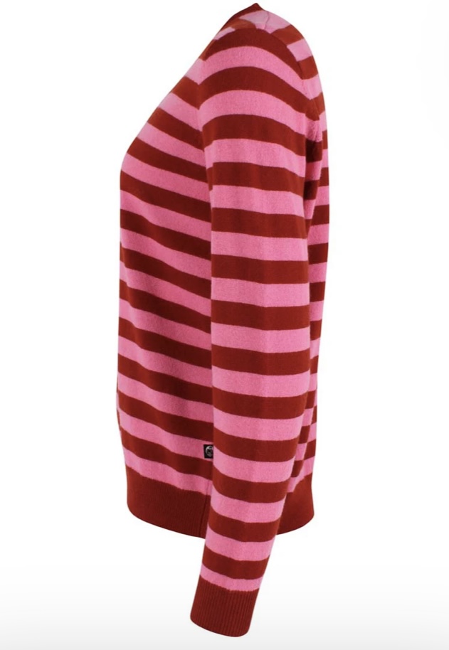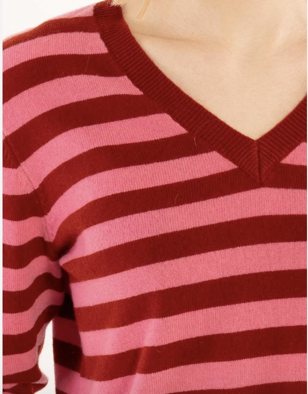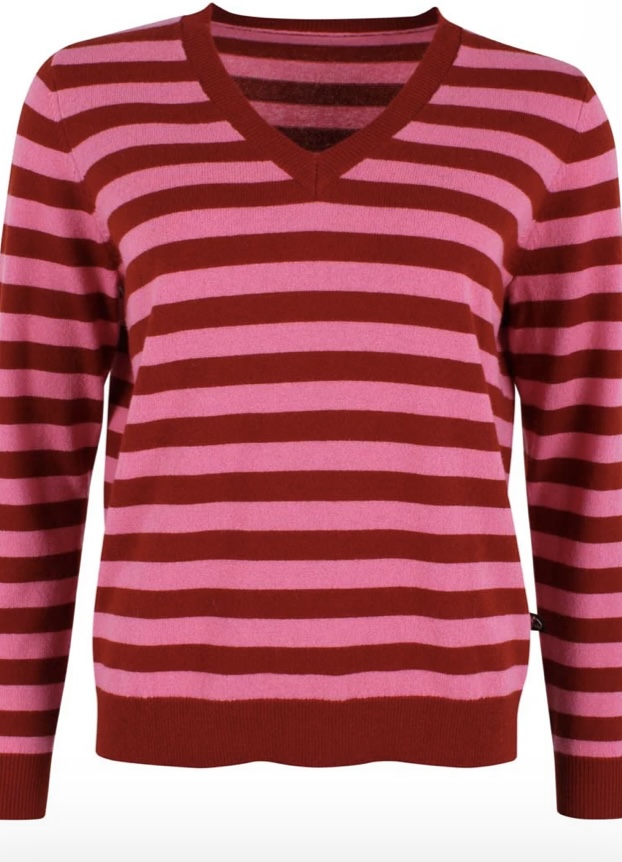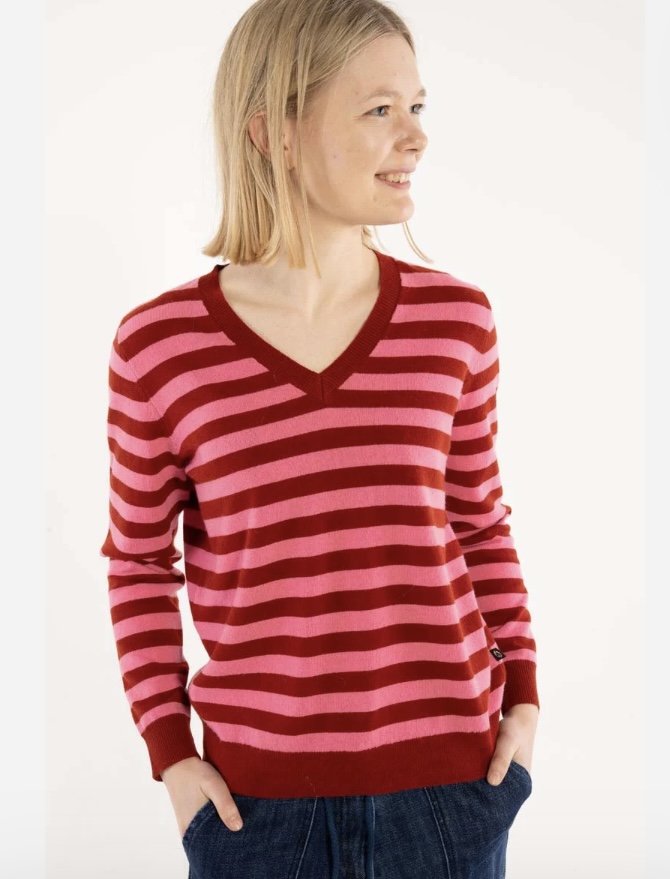 OEKO-TEX.Flot stribet merino sweater i en meget blød uldkvalitet. Den flotte V-udskæring er perfekt til skjorter og DaneSaint sweateren passer til Danefæs populære nederdele og bukser.