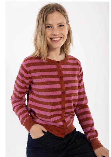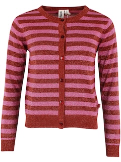 Cardigan med glitter.Flotte røde og lyserøde striber.Lækker bomuldskvalitet.Danesaga Cardigan er en super fin glittercardigan i en lækker bomuldskvalitet. Cardiganen har flotte striber i lyserød og brændt rød og glimter fint.Brug den over en kjole for et fint festlook eller kombiner den med et par bukser for et flot hverdagsoutfit.Danesaga Cardigan er lavet af et lækkert og blødt bomuldsmix, der består af 90 % bomuld og 10 % lurex.