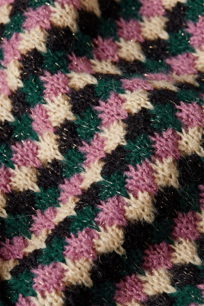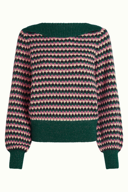 The Erin Top Flora showcases a boatneck design with long sleeves and contrasting cuffs and hem. Made from a glitter knit with stretch, it features an elegant graphic pattern and a comfortable regular fit.