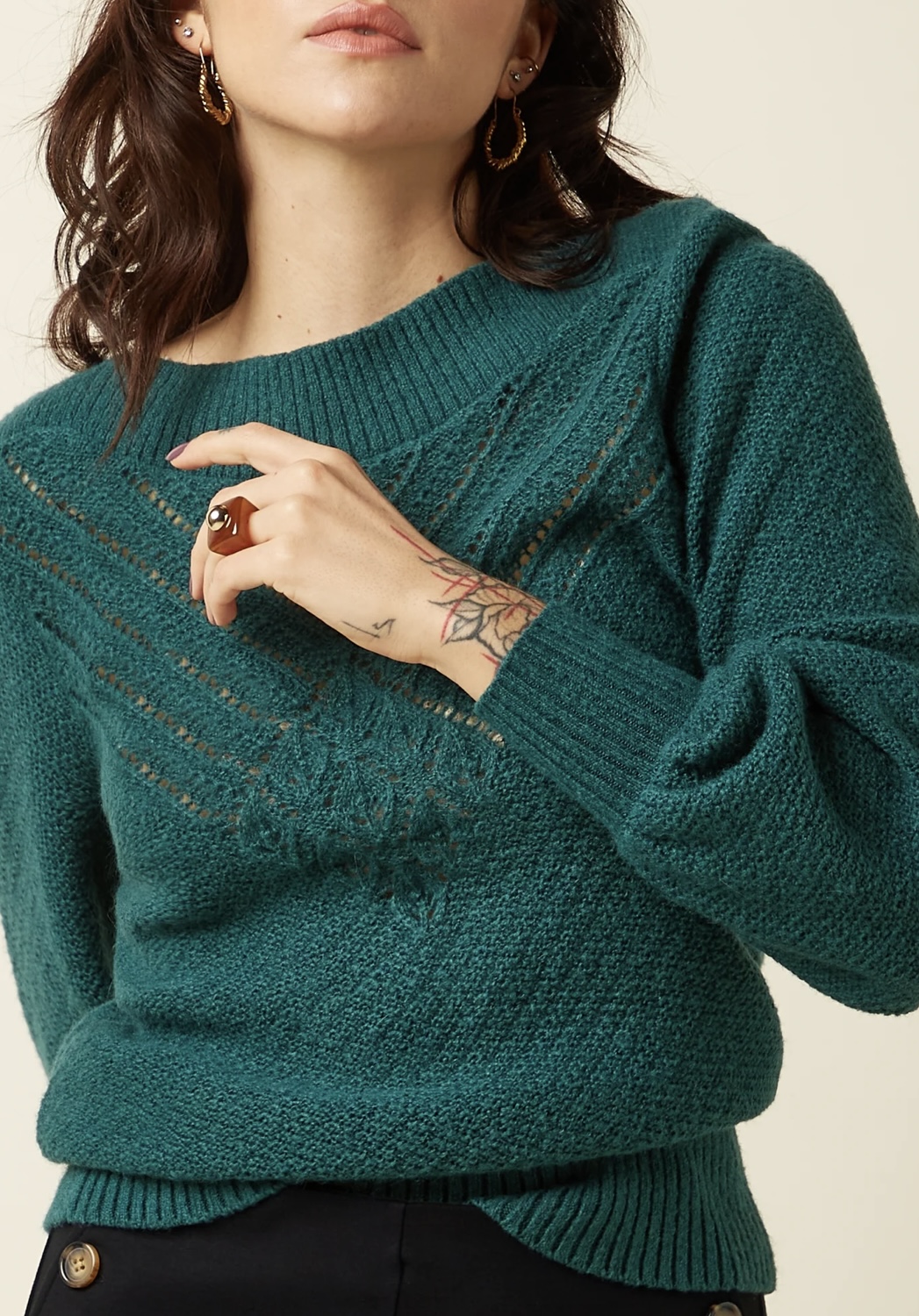 - Open knitwork at the yoke