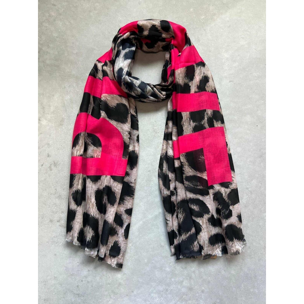 - Aflangt tørklæde med leopard print og pink Love skrift